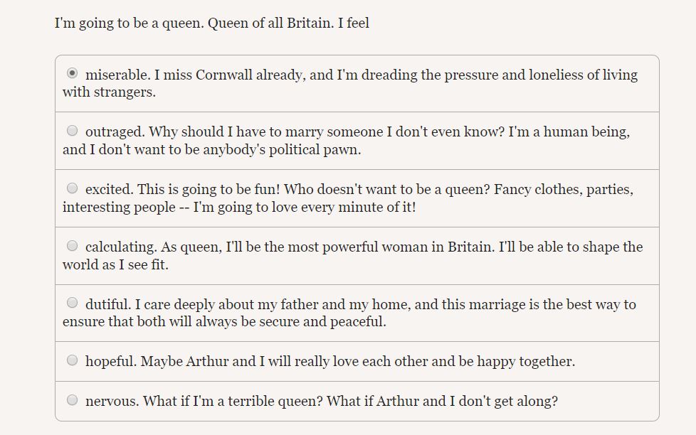 But what is Guenevere and why is it gayme of the week? To put it simply, it’s an interactive novel that puts you in the shoes of Guenevere, Arthur Pendragon’s bride and the Queen of Britain. However, you get to choose who the Queen of Britain actually is. Is she a ruthless dictator that’s willing to stomp on everyone and everything to get her way. Is she a kindhearted, but naive person? Is she really just there to have sex with everyone she can get her hands on? All interpretations of her are completely valid.