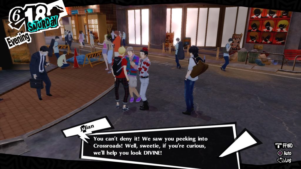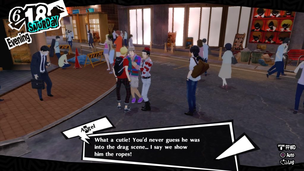 As Atlus said last month, this scene is heavily altered in the western release of Persona 5 Royal, the enhanced edition of the RPG. Now, these two have names: Angel and Julian. They approach Ryuji after having noticed him looking inside Crossroads, the local drag bar. Thinking they’ve got a new potential drag star in their proximity, Angel and Julian take Ryuji away to show him the ropes.