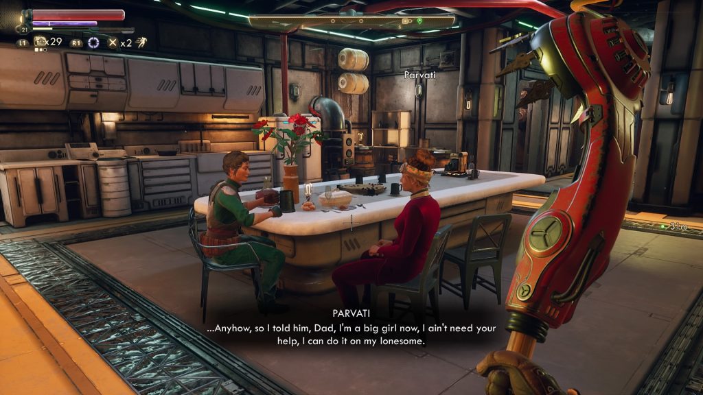 As for playing as a non-male, the biggest difference when dealing with male and female NPCs is how the Charm skill works. For men, it usually means complimenting or flattering them, whereas with women it more often that not leans into casual flirting. Again, this is likely unintentional and even a heteronormative cue that the game was written to be played by a default male character. However, playing as a woman highlights the Big Lesbian Energy which glows throughout The Outer Worlds. Whether it was supposed to be there or not, whether it was supposed to be interpreted this way or not, there’s something uniquely special about how The Outer Worlds plays out.