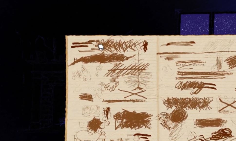 Upon close inspection, it can be seen that throughout the entire game the erasure is happening in the events at the end of the story. Kasio is locked in the house alone and ripping up her journal. However, this detail is easy to miss. Most of the time when the journal is framed, the pages fill the entire screen view. Intercut between these pages of erasure are evoked moments of the past. The interface of the eraser is replaced with a cursor to click through or drag. Different from the pages of Kasio’s journal, these are memories resurfaced, moments that have already passed. Time is twisted so that we are simultaneously experiencing a linear series of images and words following Kasio’s return to Achill while sitting in the painful climax of erasure all at once.