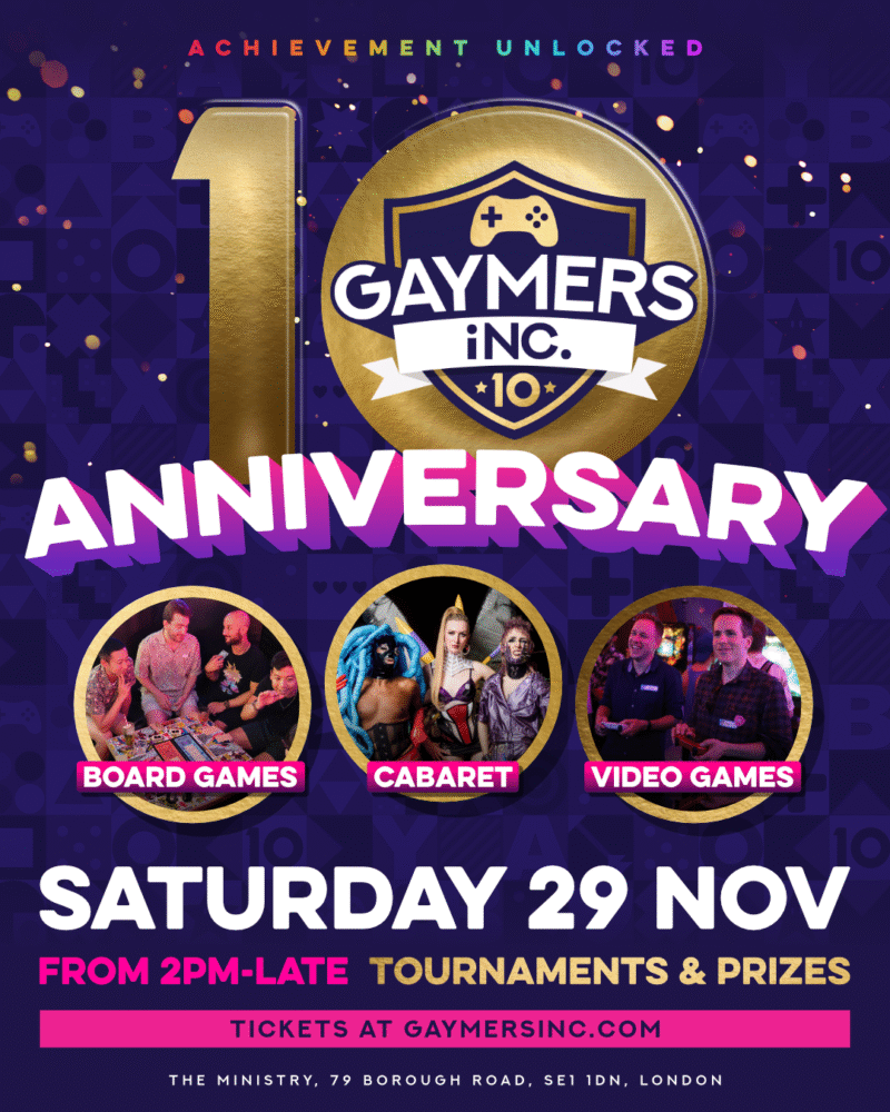 For a whole decade Gaymers iNC. has been bringing LGBTQ+ gamers and allies together across London. To celebrate turning 10, the team are planning a huge day of celebration on Saturday 29 November featuring gaming (both video games and board games), live performances, cocktails/mocktails, food and plenty of surprises at The Ministry, London.