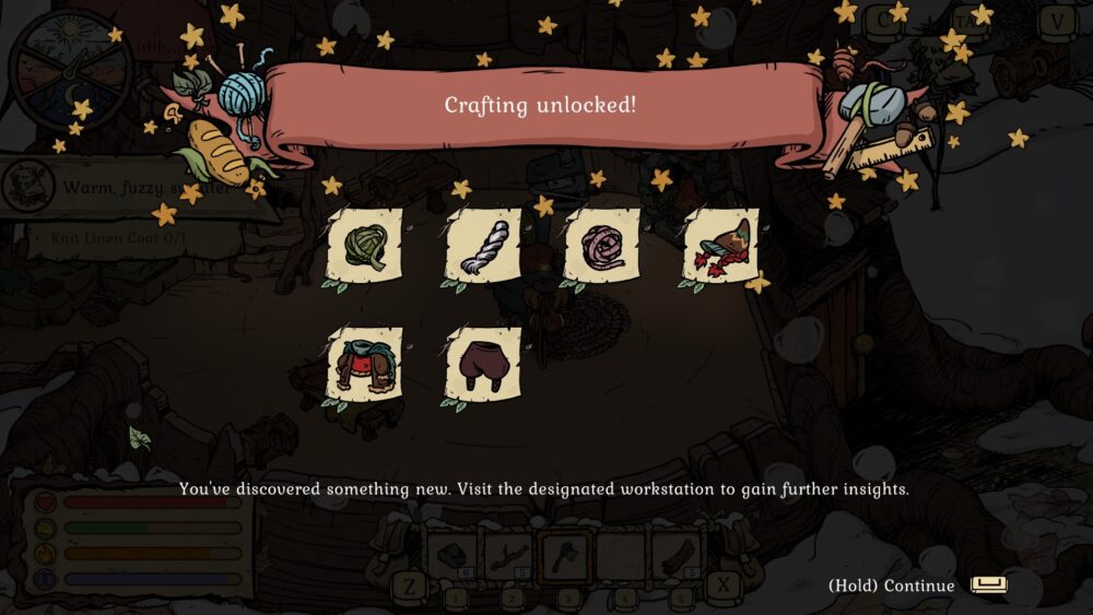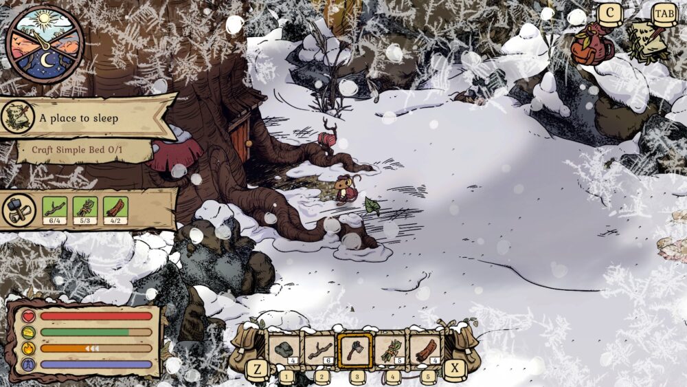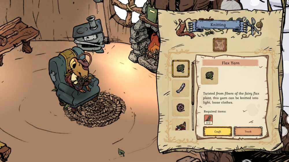 Our mouse protagonist will explore, gather resources, fight aggressive wildlife, knit warm sweaters and meet the locals as we move through this beautiful narrative experience. A survival mechanic that kept me on my toes was the ever encroaching freezing elements that could lead to freezing to death.