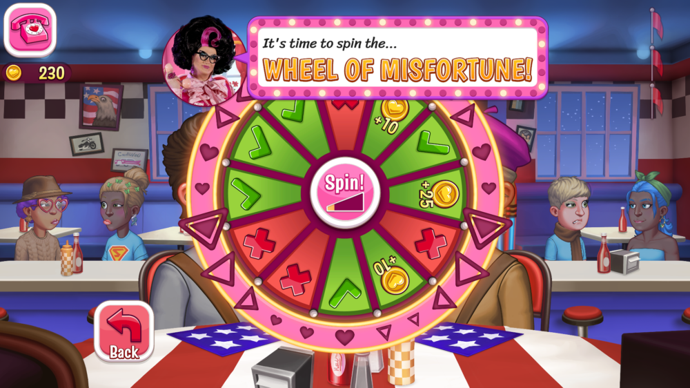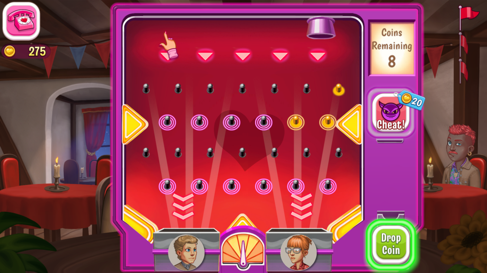 Once a suitor is selected, you then move into a date where you pick the location from a envelope, follow the target, and select how it was shuffled to get the restaurant of your choice. You start with three, and again as you progress, you can buy more.