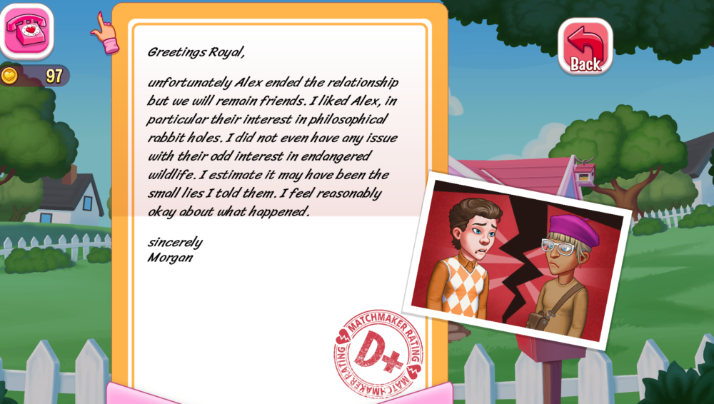 One of the mechanics of the game I find really cute is the updates you receive from your couples. They can be good (which again raises your reputation) or they can be bad (which hurts your reputation).